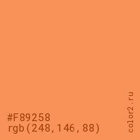 Цвет #F89258 в цветовой модели RGB обозначается тремя октетами (248, 146, 88) в десятичном формате и #F89258 в шестнадцатиричном (hex) формате, которые являются интенсивностью красного 248 (hex F8), интенсивность зелёного 146 (hex 92) и интенсивность синего 88 (hex 58).