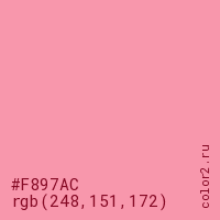 Цвет #F897AC в цветовой модели RGB обозначается тремя октетами (248, 151, 172) в десятичном формате и #F897AC в шестнадцатиричном (hex) формате, которые являются интенсивностью красного 248 (hex F8), интенсивность зелёного 151 (hex 97) и интенсивность синего 172 (hex AC).