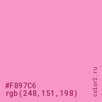 Цвет #F897C6 в цветовой модели RGB обозначается тремя октетами (248, 151, 198) в десятичном формате и #F897C6 в шестнадцатиричном (hex) формате, которые являются интенсивностью красного 248 (hex F8), интенсивность зелёного 151 (hex 97) и интенсивность синего 198 (hex C6).
