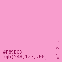 Цвет #F89DCD в цветовой модели RGB обозначается тремя октетами (248, 157, 205) в десятичном формате и #F89DCD в шестнадцатиричном (hex) формате, которые являются интенсивностью красного 248 (hex F8), интенсивность зелёного 157 (hex 9D) и интенсивность синего 205 (hex CD).