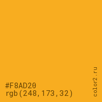 Цвет #F8AD20 в цветовой модели RGB обозначается тремя октетами (248, 173, 32) в десятичном формате и #F8AD20 в шестнадцатиричном (hex) формате, которые являются интенсивностью красного 248 (hex F8), интенсивность зелёного 173 (hex AD) и интенсивность синего 32 (hex 20).