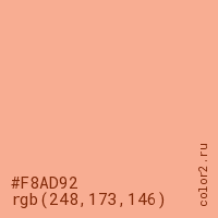 Цвет #F8AD92 в цветовой модели RGB обозначается тремя октетами (248, 173, 146) в десятичном формате и #F8AD92 в шестнадцатиричном (hex) формате, которые являются интенсивностью красного 248 (hex F8), интенсивность зелёного 173 (hex AD) и интенсивность синего 146 (hex 92).
