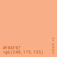 Цвет #F8AF87 в цветовой модели RGB обозначается тремя октетами (248, 175, 135) в десятичном формате и #F8AF87 в шестнадцатиричном (hex) формате, которые являются интенсивностью красного 248 (hex F8), интенсивность зелёного 175 (hex AF) и интенсивность синего 135 (hex 87).
