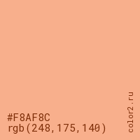Цвет #F8AF8C в цветовой модели RGB обозначается тремя октетами (248, 175, 140) в десятичном формате и #F8AF8C в шестнадцатиричном (hex) формате, которые являются интенсивностью красного 248 (hex F8), интенсивность зелёного 175 (hex AF) и интенсивность синего 140 (hex 8C).