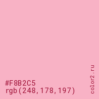 Цвет #F8B2C5 в цветовой модели RGB обозначается тремя октетами (248, 178, 197) в десятичном формате и #F8B2C5 в шестнадцатиричном (hex) формате, которые являются интенсивностью красного 248 (hex F8), интенсивность зелёного 178 (hex B2) и интенсивность синего 197 (hex C5).