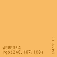 Цвет #F8BB64 в цветовой модели RGB обозначается тремя октетами (248, 187, 100) в десятичном формате и #F8BB64 в шестнадцатиричном (hex) формате, которые являются интенсивностью красного 248 (hex F8), интенсивность зелёного 187 (hex BB) и интенсивность синего 100 (hex 64).