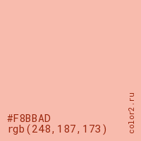 Цвет #F8BBAD в цветовой модели RGB обозначается тремя октетами (248, 187, 173) в десятичном формате и #F8BBAD в шестнадцатиричном (hex) формате, которые являются интенсивностью красного 248 (hex F8), интенсивность зелёного 187 (hex BB) и интенсивность синего 173 (hex AD).