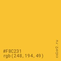 Цвет #F8C231 в цветовой модели RGB обозначается тремя октетами (248, 194, 49) в десятичном формате и #F8C231 в шестнадцатиричном (hex) формате, которые являются интенсивностью красного 248 (hex F8), интенсивность зелёного 194 (hex C2) и интенсивность синего 49 (hex 31).