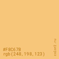 Цвет #F8C67B в цветовой модели RGB обозначается тремя октетами (248, 198, 123) в десятичном формате и #F8C67B в шестнадцатиричном (hex) формате, которые являются интенсивностью красного 248 (hex F8), интенсивность зелёного 198 (hex C6) и интенсивность синего 123 (hex 7B).