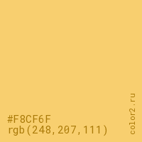 Цвет #F8CF6F в цветовой модели RGB обозначается тремя октетами (248, 207, 111) в десятичном формате и #F8CF6F в шестнадцатиричном (hex) формате, которые являются интенсивностью красного 248 (hex F8), интенсивность зелёного 207 (hex CF) и интенсивность синего 111 (hex 6F).