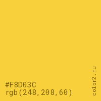 Цвет #F8D03C в цветовой модели RGB обозначается тремя октетами (248, 208, 60) в десятичном формате и #F8D03C в шестнадцатиричном (hex) формате, которые являются интенсивностью красного 248 (hex F8), интенсивность зелёного 208 (hex D0) и интенсивность синего 60 (hex 3C).