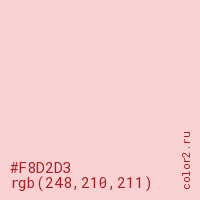 Цвет #F8D2D3 в цветовой модели RGB обозначается тремя октетами (248, 210, 211) в десятичном формате и #F8D2D3 в шестнадцатиричном (hex) формате, которые являются интенсивностью красного 248 (hex F8), интенсивность зелёного 210 (hex D2) и интенсивность синего 211 (hex D3).