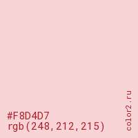 Цвет #F8D4D7 в цветовой модели RGB обозначается тремя октетами (248, 212, 215) в десятичном формате и #F8D4D7 в шестнадцатиричном (hex) формате, которые являются интенсивностью красного 248 (hex F8), интенсивность зелёного 212 (hex D4) и интенсивность синего 215 (hex D7).