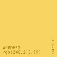 Цвет #F8D563 в цветовой модели RGB обозначается тремя октетами (248, 213, 99) в десятичном формате и #F8D563 в шестнадцатиричном (hex) формате, которые являются интенсивностью красного 248 (hex F8), интенсивность зелёного 213 (hex D5) и интенсивность синего 99 (hex 63).
