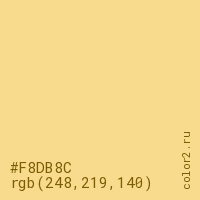 Цвет #F8DB8C в цветовой модели RGB обозначается тремя октетами (248, 219, 140) в десятичном формате и #F8DB8C в шестнадцатиричном (hex) формате, которые являются интенсивностью красного 248 (hex F8), интенсивность зелёного 219 (hex DB) и интенсивность синего 140 (hex 8C).