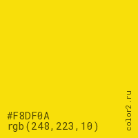 Цвет #F8DF0A в цветовой модели RGB обозначается тремя октетами (248, 223, 10) в десятичном формате и #F8DF0A в шестнадцатиричном (hex) формате, которые являются интенсивностью красного 248 (hex F8), интенсивность зелёного 223 (hex DF) и интенсивность синего 10 (hex 0A).