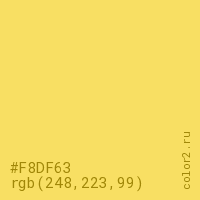 Цвет #F8DF63 в цветовой модели RGB обозначается тремя октетами (248, 223, 99) в десятичном формате и #F8DF63 в шестнадцатиричном (hex) формате, которые являются интенсивностью красного 248 (hex F8), интенсивность зелёного 223 (hex DF) и интенсивность синего 99 (hex 63).
