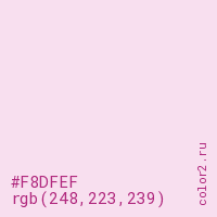 Цвет #F8DFEF в цветовой модели RGB обозначается тремя октетами (248, 223, 239) в десятичном формате и #F8DFEF в шестнадцатиричном (hex) формате, которые являются интенсивностью красного 248 (hex F8), интенсивность зелёного 223 (hex DF) и интенсивность синего 239 (hex EF).