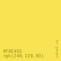 Цвет #F8E453 в цветовой модели RGB обозначается тремя октетами (248, 228, 83) в десятичном формате и #F8E453 в шестнадцатиричном (hex) формате, которые являются интенсивностью красного 248 (hex F8), интенсивность зелёного 228 (hex E4) и интенсивность синего 83 (hex 53).