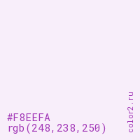 Цвет #F8EEFA в цветовой модели RGB обозначается тремя октетами (248, 238, 250) в десятичном формате и #F8EEFA в шестнадцатиричном (hex) формате, которые являются интенсивностью красного 248 (hex F8), интенсивность зелёного 238 (hex EE) и интенсивность синего 250 (hex FA).