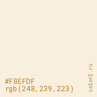 Цвет #F8EFDF в цветовой модели RGB обозначается тремя октетами (248, 239, 223) в десятичном формате и #F8EFDF в шестнадцатиричном (hex) формате, которые являются интенсивностью красного 248 (hex F8), интенсивность зелёного 239 (hex EF) и интенсивность синего 223 (hex DF).