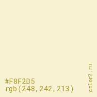 Цвет #F8F2D5 в цветовой модели RGB обозначается тремя октетами (248, 242, 213) в десятичном формате и #F8F2D5 в шестнадцатиричном (hex) формате, которые являются интенсивностью красного 248 (hex F8), интенсивность зелёного 242 (hex F2) и интенсивность синего 213 (hex D5).