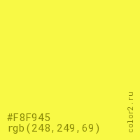 Цвет #F8F945 в цветовой модели RGB обозначается тремя октетами (248, 249, 69) в десятичном формате и #F8F945 в шестнадцатиричном (hex) формате, которые являются интенсивностью красного 248 (hex F8), интенсивность зелёного 249 (hex F9) и интенсивность синего 69 (hex 45).