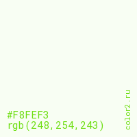 Цвет #F8FEF3 в цветовой модели RGB обозначается тремя октетами (248, 254, 243) в десятичном формате и #F8FEF3 в шестнадцатиричном (hex) формате, которые являются интенсивностью красного 248 (hex F8), интенсивность зелёного 254 (hex FE) и интенсивность синего 243 (hex F3).