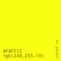 Цвет #F8FF12 в цветовой модели RGB обозначается тремя октетами (248, 255, 18) в десятичном формате и #F8FF12 в шестнадцатиричном (hex) формате, которые являются интенсивностью красного 248 (hex F8), интенсивность зелёного 255 (hex FF) и интенсивность синего 18 (hex 12).