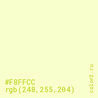 Цвет #F8FFCC в цветовой модели RGB обозначается тремя октетами (248, 255, 204) в десятичном формате и #F8FFCC в шестнадцатиричном (hex) формате, которые являются интенсивностью красного 248 (hex F8), интенсивность зелёного 255 (hex FF) и интенсивность синего 204 (hex CC).