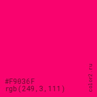 Цвет #F9036F в цветовой модели RGB обозначается тремя октетами (249, 3, 111) в десятичном формате и #F9036F в шестнадцатиричном (hex) формате, которые являются интенсивностью красного 249 (hex F9), интенсивность зелёного 3 (hex 03) и интенсивность синего 111 (hex 6F).