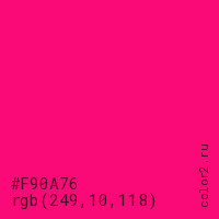 Цвет #F90A76 в цветовой модели RGB обозначается тремя октетами (249, 10, 118) в десятичном формате и #F90A76 в шестнадцатиричном (hex) формате, которые являются интенсивностью красного 249 (hex F9), интенсивность зелёного 10 (hex 0A) и интенсивность синего 118 (hex 76).