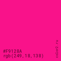 Цвет #F9128A в цветовой модели RGB обозначается тремя октетами (249, 18, 138) в десятичном формате и #F9128A в шестнадцатиричном (hex) формате, которые являются интенсивностью красного 249 (hex F9), интенсивность зелёного 18 (hex 12) и интенсивность синего 138 (hex 8A).