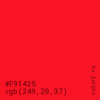 Цвет #F91425 в цветовой модели RGB обозначается тремя октетами (249, 20, 37) в десятичном формате и #F91425 в шестнадцатиричном (hex) формате, которые являются интенсивностью красного 249 (hex F9), интенсивность зелёного 20 (hex 14) и интенсивность синего 37 (hex 25).