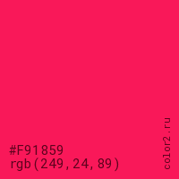 Цвет #F91859 в цветовой модели RGB обозначается тремя октетами (249, 24, 89) в десятичном формате и #F91859 в шестнадцатиричном (hex) формате, которые являются интенсивностью красного 249 (hex F9), интенсивность зелёного 24 (hex 18) и интенсивность синего 89 (hex 59).
