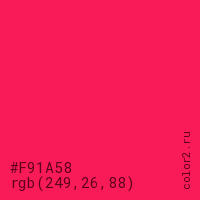 Цвет #F91A58 в цветовой модели RGB обозначается тремя октетами (249, 26, 88) в десятичном формате и #F91A58 в шестнадцатиричном (hex) формате, которые являются интенсивностью красного 249 (hex F9), интенсивность зелёного 26 (hex 1A) и интенсивность синего 88 (hex 58).