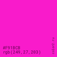 Цвет #F91BCB в цветовой модели RGB обозначается тремя октетами (249, 27, 203) в десятичном формате и #F91BCB в шестнадцатиричном (hex) формате, которые являются интенсивностью красного 249 (hex F9), интенсивность зелёного 27 (hex 1B) и интенсивность синего 203 (hex CB).