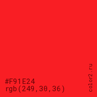 Цвет #F91E24 в цветовой модели RGB обозначается тремя октетами (249, 30, 36) в десятичном формате и #F91E24 в шестнадцатиричном (hex) формате, которые являются интенсивностью красного 249 (hex F9), интенсивность зелёного 30 (hex 1E) и интенсивность синего 36 (hex 24).