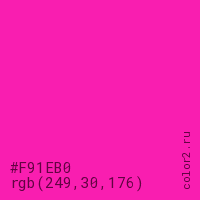 Цвет #F91EB0 в цветовой модели RGB обозначается тремя октетами (249, 30, 176) в десятичном формате и #F91EB0 в шестнадцатиричном (hex) формате, которые являются интенсивностью красного 249 (hex F9), интенсивность зелёного 30 (hex 1E) и интенсивность синего 176 (hex B0).