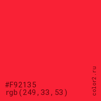 Цвет #F92135 в цветовой модели RGB обозначается тремя октетами (249, 33, 53) в десятичном формате и #F92135 в шестнадцатиричном (hex) формате, которые являются интенсивностью красного 249 (hex F9), интенсивность зелёного 33 (hex 21) и интенсивность синего 53 (hex 35).