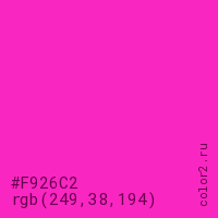 Цвет #F926C2 в цветовой модели RGB обозначается тремя октетами (249, 38, 194) в десятичном формате и #F926C2 в шестнадцатиричном (hex) формате, которые являются интенсивностью красного 249 (hex F9), интенсивность зелёного 38 (hex 26) и интенсивность синего 194 (hex C2).