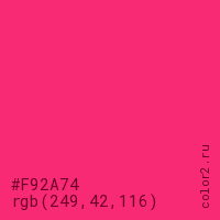 Цвет #F92A74 в цветовой модели RGB обозначается тремя октетами (249, 42, 116) в десятичном формате и #F92A74 в шестнадцатиричном (hex) формате, которые являются интенсивностью красного 249 (hex F9), интенсивность зелёного 42 (hex 2A) и интенсивность синего 116 (hex 74).