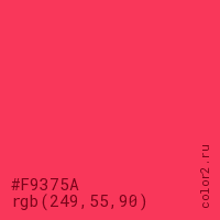 Цвет #F9375A в цветовой модели RGB обозначается тремя октетами (249, 55, 90) в десятичном формате и #F9375A в шестнадцатиричном (hex) формате, которые являются интенсивностью красного 249 (hex F9), интенсивность зелёного 55 (hex 37) и интенсивность синего 90 (hex 5A).