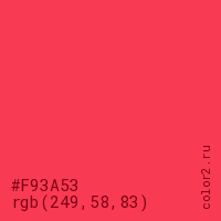 Цвет #F93A53 в цветовой модели RGB обозначается тремя октетами (249, 58, 83) в десятичном формате и #F93A53 в шестнадцатиричном (hex) формате, которые являются интенсивностью красного 249 (hex F9), интенсивность зелёного 58 (hex 3A) и интенсивность синего 83 (hex 53).