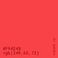 Цвет #F94248 в цветовой модели RGB обозначается тремя октетами (249, 66, 72) в десятичном формате и #F94248 в шестнадцатиричном (hex) формате, которые являются интенсивностью красного 249 (hex F9), интенсивность зелёного 66 (hex 42) и интенсивность синего 72 (hex 48).