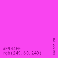 Цвет #F944F0 в цветовой модели RGB обозначается тремя октетами (249, 68, 240) в десятичном формате и #F944F0 в шестнадцатиричном (hex) формате, которые являются интенсивностью красного 249 (hex F9), интенсивность зелёного 68 (hex 44) и интенсивность синего 240 (hex F0).