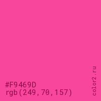 Цвет #F9469D в цветовой модели RGB обозначается тремя октетами (249, 70, 157) в десятичном формате и #F9469D в шестнадцатиричном (hex) формате, которые являются интенсивностью красного 249 (hex F9), интенсивность зелёного 70 (hex 46) и интенсивность синего 157 (hex 9D).