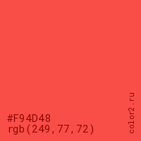 Цвет #F94D48 в цветовой модели RGB обозначается тремя октетами (249, 77, 72) в десятичном формате и #F94D48 в шестнадцатиричном (hex) формате, которые являются интенсивностью красного 249 (hex F9), интенсивность зелёного 77 (hex 4D) и интенсивность синего 72 (hex 48).