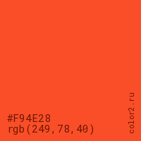 Цвет #F94E28 в цветовой модели RGB обозначается тремя октетами (249, 78, 40) в десятичном формате и #F94E28 в шестнадцатиричном (hex) формате, которые являются интенсивностью красного 249 (hex F9), интенсивность зелёного 78 (hex 4E) и интенсивность синего 40 (hex 28).