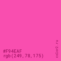 Цвет #F94EAF в цветовой модели RGB обозначается тремя октетами (249, 78, 175) в десятичном формате и #F94EAF в шестнадцатиричном (hex) формате, которые являются интенсивностью красного 249 (hex F9), интенсивность зелёного 78 (hex 4E) и интенсивность синего 175 (hex AF).